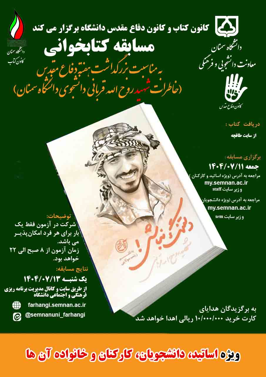 به مناسبت تکریم هفته دفاع مقدس، کانون کتاب و کانون دفاع مقدس دانشگاه، مسابقه کتابخوانی برگزار می کند.